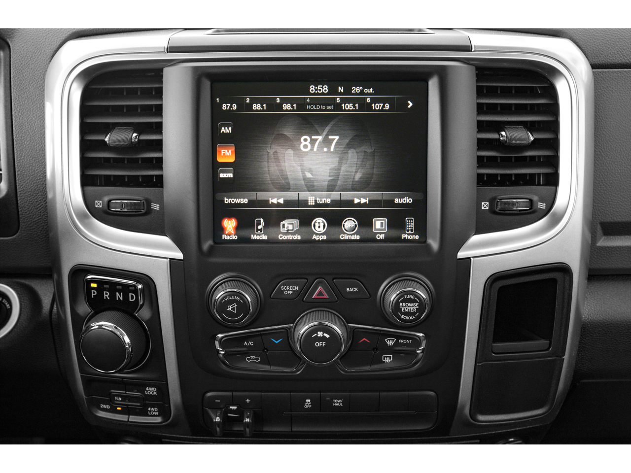 This Vehicle Includes the Following Options: 3.21 Rear Axle Ratio, 4-Wheel Disc Brakes, 40/20/40 Split Bench Seat, 6 Speakers, ABS brakes, Air Conditioning, Alloy wheels, AM/FM radio: SiriusXM, Black Exterior Mirrors, Brake assist, Bumpers: chrome, Center Hub, Compass, Delay-off headlights, Driver door bin, Dual front impact airbags, Dual front side impact airbags, Electronic Stability Control, Exterior Mirrors w/Heating Element, Front anti-roll bar, Front Armrest w/3 Cupholders, Front Center Armrest w/Storage, Front reading lights, Front wheel independent suspension, Fully automatic headlights, GPS Antenna Input, Heated door mirrors, Illuminated entry, Integrated Voice Command w/Bluetooth®, Low tire pressure warning, Manufacturer's Statement of Origin, Occupant sensing airbag, Outside temperature display, Overhead airbag, Overhead console, Panic alarm, ParkView Rear Back-Up Camera, Passenger door bin, Passenger vanity mirror, Power door mirrors, Power steering, Power windows, Radio data system, Rear anti-roll bar, Rear Floor Mats, Rear seat center armrest, Rear step bumper, Remote keyless entry, Remote USB Port - Charge Only, Speed control, Storage Tray, Tachometer, Tilt steering wheel, Traction control, Trip computer, Variably intermittent wipers, and Voltmeter.