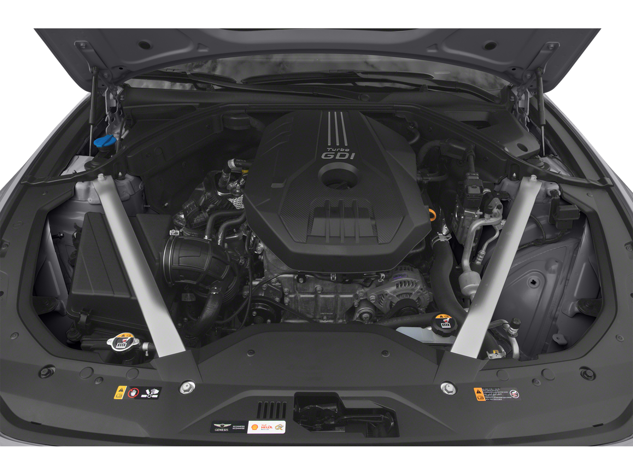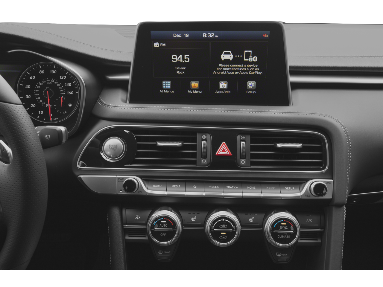 - Radio: AM/FM/SiriusXM/HD Audio System -inc: 6 channel internal amplifier, 6 speakers including subwoofer, 8" touchscreen display, front 12V power outlet, steering wheel controls, Android Auto, Apple CarPlay, 2 front USB ports, auxiliary input jack, Bluetooth® hands-free phone system and Genesis Connected Services