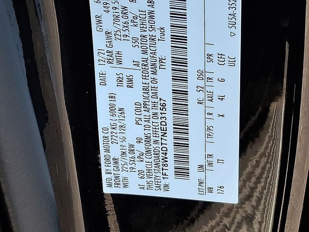 THIS VEHICLE INCLUDES THE FOLLOWING FEATURES AND OPTIONS: FX4 Off-Road Package, GVWR: 14,000 lb Payload Package, Order Code 778A, 4WD, 10 Speakers, 19.5 Forged Polished Aluminum Wheels, 4-Wheel Disc Brakes, ABS brakes, Adjustable pedals, Air Conditioning, Alloy wheels, AM/FM radio: SiriusXM with 360L, Auto High-beam Headlights, Auto tilt-away steering wheel, Auto-dimming Rear-View mirror, Automatic temperature control, Brake assist, Bumpers: body-color, Compass, Delay-off headlights, Driver door bin, Driver vanity mirror, Dual front impact airbags, Dual front side impact airbags, Dual rear wheels, Electronic Stability Control, Emergency communication system: SYNC 4 911 Assist, Exterior Parking Camera Rear, Flow-Through Console, Front anti-roll bar, Front Bucket Seats, Front Center Armrest, Front dual zone A/C, Front fog lights, Front reading lights, Fully automatic headlights, Garage door transmitter, Heated door mirrors, Heated front seats, Heated rear seats, Heated steering wheel, Illuminated entry, Leather steering wheel, Limited Slip w/4.30 Axle Ratio, Memory seat, Navigation system: Connected Navigation, Outside temperature display, Overhead airbag, Overhead console, Panic alarm, Passenger door bin, Passenger vanity mirror, Pedal memory, Power door mirrors, Power driver seat, Power moonroof, Power passenger seat, Power steering, Power windows, Radio data system, Radio: B&O Sound System by Bang & Olufsen, Rain sensing wipers, Rear anti-roll bar, Rear Parking Sensors, Rear reading lights, Rear seat center armrest, Rear step bumper, Rear window defroster, Remote keyless entry, Security system, SiriusXM Radio w/360L, Speed control, Speed-sensing steering, Split folding rear seat, Steering wheel memory, Steering wheel mounted A/C controls, Steering wheel mounted audio controls, SYNC 4 w/Enhanced Voice Recognition, Tachometer, Telescoping steering wheel, Tilt steering wheel, Traction control, Trip computer, Turn signal indicator mirrors, Unique Limited 2-Tone Leather 40/Console/40 Seats, Variably intermittent wipers, and Ventilated front seats.