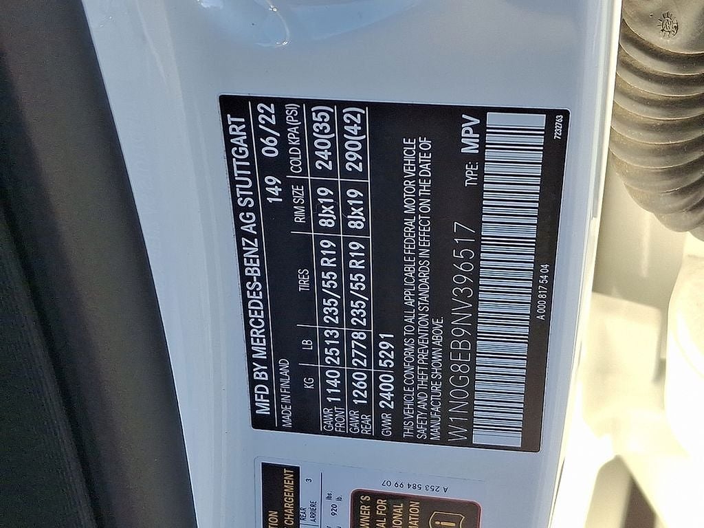 THIS VEHICLE INCLUDES THE FOLLOWING FEATURES AND OPTIONS: 10.25 Center Touchscreen Display, 3.27 Axle Ratio, 4-Way Lumbar Support, 4-Wheel Disc Brakes, 6 Speakers, ABS brakes, Air Conditioning, Alloy wheels, AM/FM radio, Apple CarPlay®/Android Auto®, Auto High-beam Headlights, Auto tilt-away steering wheel, Auto-dimming door mirrors, Auto-dimming Rear-View mirror, Automatic temperature control, Brake assist, Bumpers: body-color, Child-Seat-Sensing Airbag, Delay-off headlights, Driver door bin, Driver vanity mirror, Dual front impact airbags, Dual front side impact airbags, Electronic Stability Control, Emergency communication system: eCall Emergency System, Exterior Parking Camera Rear, Four wheel independent suspension, Front anti-roll bar, Front Bucket Seats, Front Center Armrest, Front dual zone A/C, Front reading lights, Fully automatic headlights, Garage door transmitter: HomeLink, Genuine wood dashboard insert, Heated door mirrors, Heated Front Bucket Seats, Heated front seats, Illuminated entry, Knee airbag, Leather steering wheel, Low tire pressure warning, MB-Tex Upholstery, Memory seat, Occupant sensing airbag, Outside temperature display, Overhead airbag, Overhead console, Panic alarm, Passenger door bin, Passenger vanity mirror, Power door mirrors, Power driver seat, Power Front Seat w/Driver Memory, Power Liftgate, Power passenger seat, Power steering, Power windows, Radio data system, Radio: MBUX Multimedia System, Rain sensing wipers, Rear anti-roll bar, Rear fog lights, Rear reading lights, Rear seat center armrest, Rear window defroster, Rear window wiper, Remote keyless entry, Roof rack: rails only, Security system, Speed control, Speed-sensing steering, Split folding rear seat, Spoiler, Steering wheel memory, Steering wheel mounted audio controls, Tachometer, Telescoping steering wheel, Tilt steering wheel, Traction control, Trip computer, Turn signal indicator mirrors, Variably intermittent wipers, and Wheels: 8J x 18 ET 38 Split 5-Spoke. 21/28 City/Highway MPG