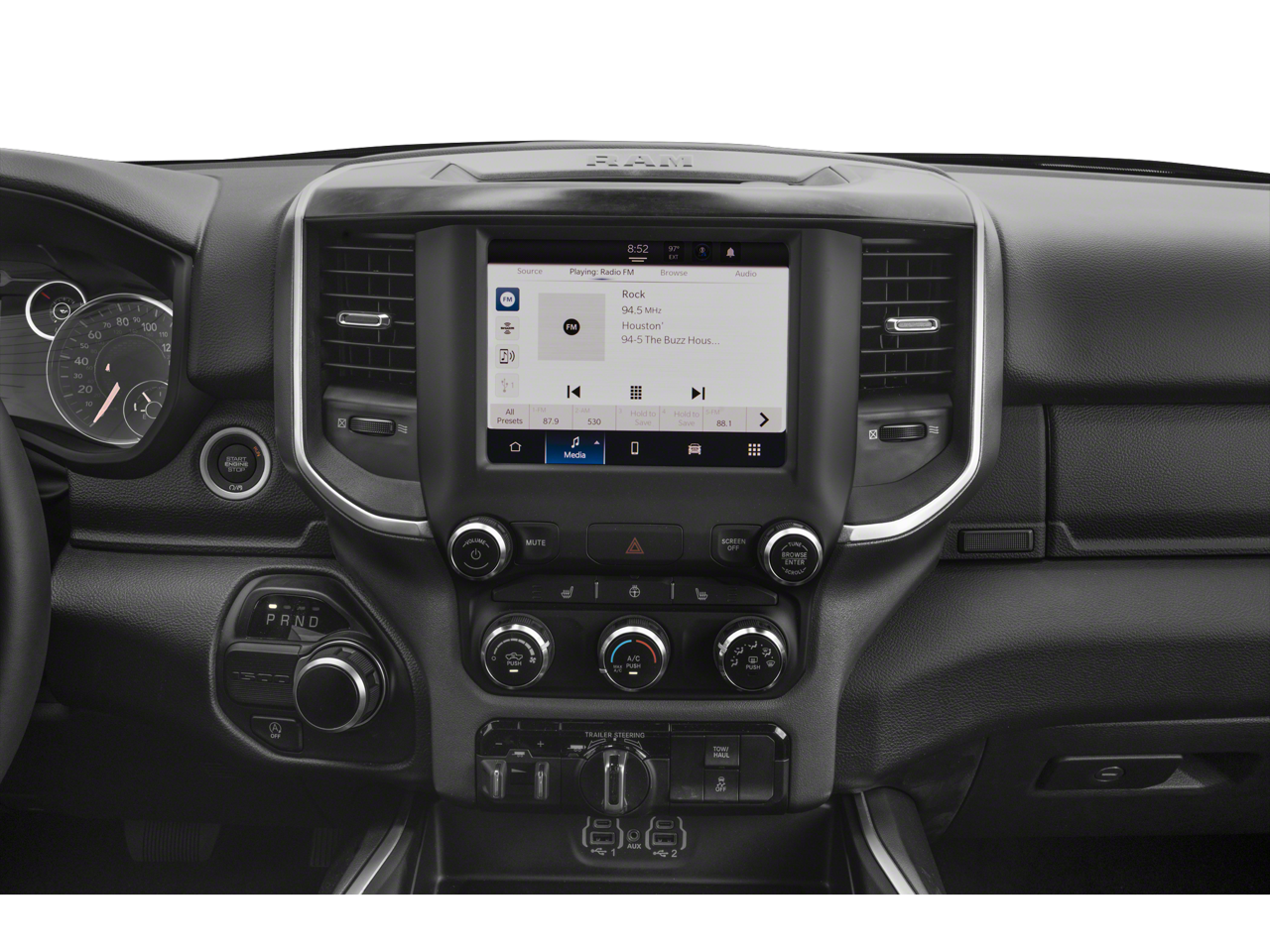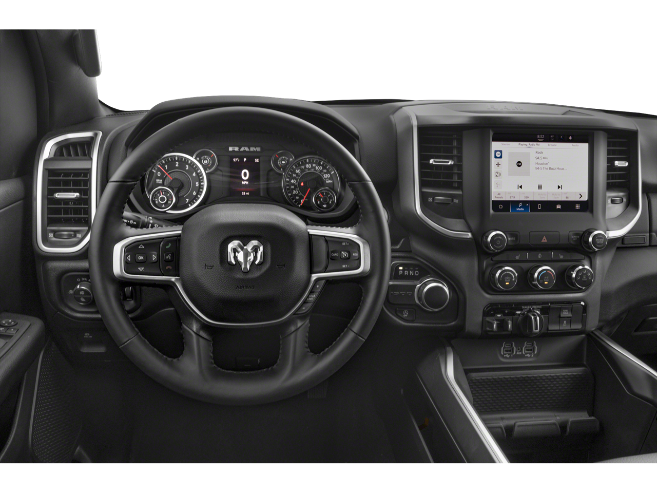 THIS VEHICLE INCLUDES THE FOLLOWING FEATURES AND OPTIONS: Big Horn Level 1 Equipment Group (2nd Row In Floor Storage Bins, 4G LTE Wi-Fi Hot Spot, 8.4 Touchscreen Display, Apple CarPlay, Auto-Dimming Exterior Driver Mirror, Auto-Dimming Rear-View Mirror, Black Exterior Mirrors, Black Premium Power Mirrors, Bluetooth® Handsfree Phone & Audio, Class IV Receiver Hitch, Connectivity - US/Canada, Convex Wide-Angle Exterior Mirror Insert, Electric Shift-On-Demand Transfer Case, Exterior Mirrors Courtesy Lamps, Exterior Mirrors w/Heating Element, Exterior Mirrors w/Supplemental Signals, For Details, Visit DriveUconnect.com, For More Info, Call 800-643-2112, Front Fog Lamps, Glove Box Lamp, Google Android Auto, GPS Antenna Input, Heated Front Seats, Heated Steering Wheel, Integrated Center Stack Radio, Passenger Sun Visor w/Illuminated Mirror, Power-Folding Mirrors, Radio: Uconnect 5 W w/8.4 Display, Rear Dome w/On/Off Switch Lamp, Rear Power Sliding Window, Rear Window Defroster, SiriusXM Satellite Radio, and USB Host Flip), Quick Order Package 23R Lone Star (Regional) (Lone Star Badge), 3 Rear Seat Head Restraints, 3.21 Rear Axle Ratio, 4 Way Front Headrests, 4-Wheel Disc Brakes, 48V Belt Starter Generator, 6 Speakers, ABS brakes, Air Conditioning, Alloy wheels, AM/FM radio, Brake assist, Bumpers: chrome, Cloth Bench Seat, Compass, Delay-off headlights, Driver door bin, Dual front impact airbags, Dual front side impact airbags, Electronic Stability Control, Emergency communication system: SiriusXM Guardian, Front anti-roll bar, Front Center Armrest w/Storage, Front License Plate Bracket, Front reading lights, Front Seat Back Map Pockets, Front wheel independent suspension, Fully automatic headlights, Global Telematics Box Module (TBM), Heated door mirrors, Illuminated entry, Integrated Voice Command w/Bluetooth®, Leather steering wheel, Low tire pressure warning, Manufacturer's Statement of Origin, Occupant sensing airbag, Outside temperature display, Overhead airbag, Overhead console, Panic alarm, ParkView Rear Back-Up Camera, Passenger door bin, Passenger vanity mirror, Power door mirrors, Power steering, Power windows, Radio data system, Radio: Uconnect 3 w/5 Display, RAM Grille Badge - Chrome, Rear 60/40 Folding Seat, Rear anti-roll bar, Rear seat center armrest, Rear step bumper, Remote keyless entry, Remote Start System, Speed control, Split folding rear seat, Steering wheel mounted audio controls, Tachometer, Telescoping steering wheel, Tilt steering wheel, Traction control, Trip computer, Variably intermittent wipers, Voltmeter, and Wheels: 18 x 8 Cast-Aluminum Painted.
