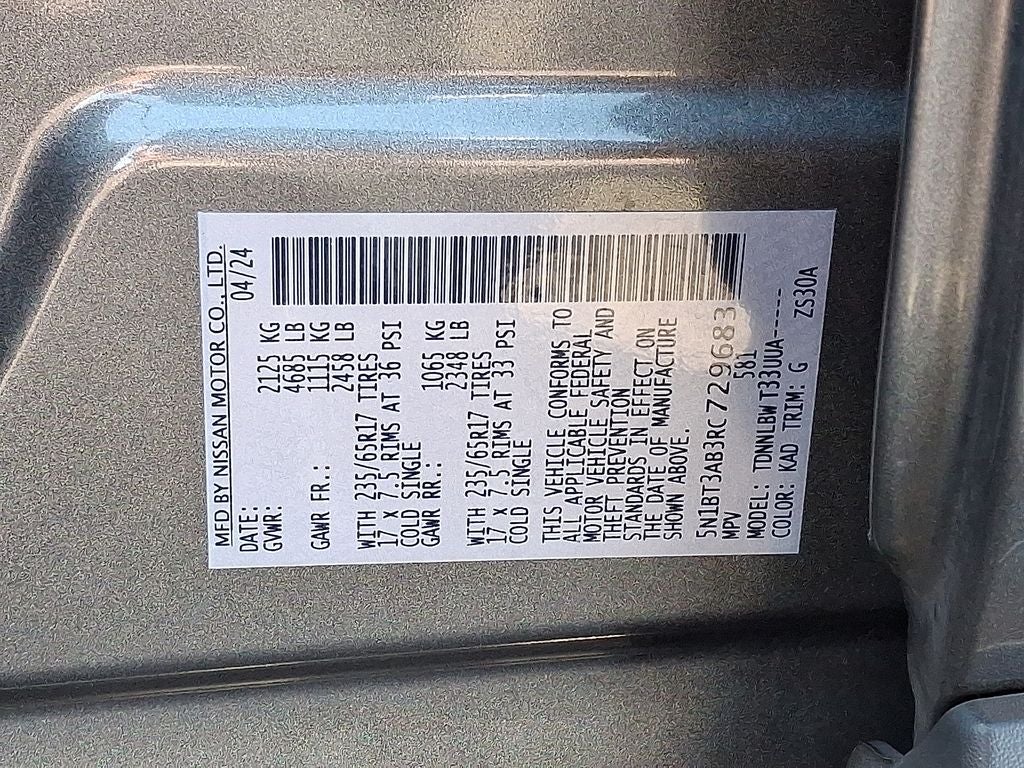 THIS VEHICLE INCLUDES THE FOLLOWING FEATURES AND OPTIONS: AWD, 17 Aluminum Alloy Wheels, 4 Speakers, 4-Wheel Disc Brakes, 5.676 Axle Ratio, ABS brakes, Air Conditioning, Alloy wheels, AM/FM radio: SiriusXM, Auto High-beam Headlights, Blind Spot Warning, Brake assist, Bumpers: body-color, Cloth Seat Trim, Delay-off headlights, Driver door bin, Driver vanity mirror, Dual front impact airbags, Dual front side impact airbags, Electronic Stability Control, First Aid Kit, Floor Mats w/1-Piece Cargo Area Protector, Four wheel independent suspension, Front anti-roll bar, Front Bucket Seats, Front Center Armrest, Front reading lights, Fully automatic headlights, Illuminated entry, Knee airbag, Low tire pressure warning, NissanConnect featuring Apple CarPlay and Android Auto, Occupant sensing airbag, Outside temperature display, Overhead airbag, Overhead console, Panic alarm, Passenger door bin, Passenger vanity mirror, Power door mirrors, Power steering, Power windows, Radio data system, Radio: AM/FM NissanConnect, Rear anti-roll bar, Rear Parking Sensors, Rear seat center armrest, Rear side impact airbag, Rear window defroster, Rear window wiper, Remote keyless entry, Speed control, Speed-Sensitive Wipers, Split folding rear seat, Spoiler, Steering wheel mounted audio controls, Tachometer, Telescoping steering wheel, Tilt steering wheel, Traction control, Trip computer, and Variably intermittent wipers. 28/35 City/Highway MPG