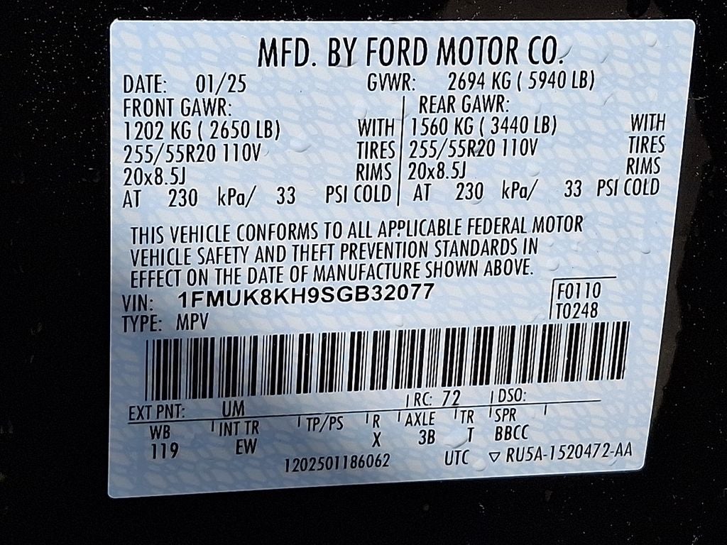 THIS VEHICLE INCLUDES THE FOLLOWING FEATURES AND OPTIONS: Equipment Group 300A Standard Package, 4WD, 10 Speakers, 2nd Row Captain's Chairs w/E-Z Entry & Armrest, 3.58 Non-Limited Slip Rear Axle, 3rd row seats: bench, 4-Wheel Disc Brakes, ABS brakes, Air Conditioning, Alloy wheels, AM/FM radio: SiriusXM with 360L, Apple CarPlay/Android Auto, Auto High-beam Headlights, Automatic temperature control, Brake assist, Bumpers: body-color, Compass, Delay-off headlights, Driver door bin, Driver vanity mirror, Dual front impact airbags, Dual front side impact airbags, Electronic Stability Control, Emergency communication system: 911 Assist, Exterior Parking Camera Rear, Four wheel independent suspension, Front anti-roll bar, Front Bucket Seats, Front Center Armrest, Front dual zone A/C, Front fog lights, Front License Plate Bracket, Front reading lights, Fully automatic headlights, Garage door transmitter, Heated door mirrors, Heated front seats, Heated steering wheel, Heated Unique Cloth Captain's Chairs, Illuminated entry, Internet access capable: FordPass Connect 5G, Knee airbag, Leather steering wheel, Low tire pressure warning, Navigation System, Occupant sensing airbag, Outside temperature display, Overhead airbag, Overhead console, Panic alarm, Passenger door bin, Passenger vanity mirror, Power door mirrors, Power driver seat, Power Liftgate, Power passenger seat, Power steering, Power windows, Radio: B&O Sound System by Bang & Olufsen, Rear air conditioning, Rear anti-roll bar, Rear reading lights, Rear window defroster, Rear window wiper, Remote keyless entry, Security system, Speed control, Speed-sensing steering, Speed-Sensitive Wipers, Split folding rear seat, Spoiler, Steering wheel mounted audio controls, Tachometer, Telescoping steering wheel, Tilt steering wheel, Traction control, Trip computer, Variably intermittent wipers, and Wheels: 20 Ebony-Painted Machined Aluminum. 20/27 City/Highway MPG